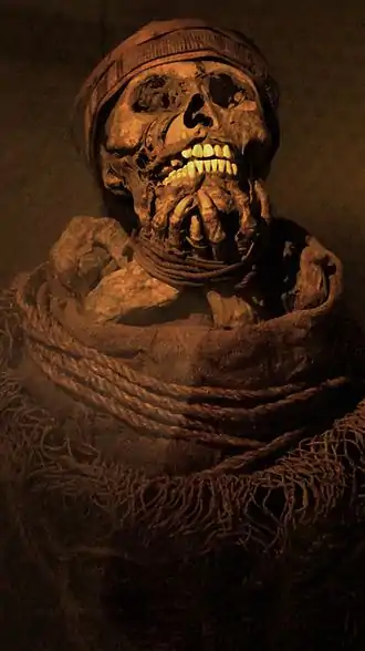 The dead, as reported in Epítome de la conquista del Nuevo Reino de Granada, are buried in two ways; in Tunja the main members of society are not buried, yet their intestines taken out, wrapped in cloths, and adorned with gold and emeralds placed on slightly elevated beds in special dedicated bohíos and left there forever.[15] The other way of treating the deceased Muisca is in Bogotá, where they are buried or thrown into the deepest lakes after putting them in coffins filled with gold and emeralds.[16]