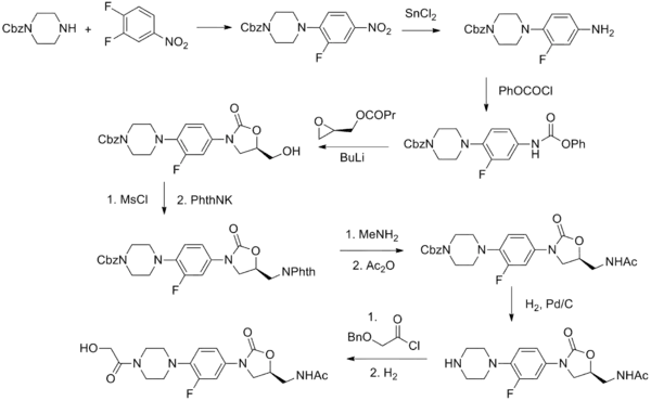 - Brickner SJ, Hutchinson DK, Barbachyn MR, Manninen PR, Ulanowicz DA, Garmon SA, et al. (February 1996). "Synthesis and antibacterial activity of U-100592 and U-100766, two oxazolidinone antibacterial agents for the potential treatment of multidrug-resistant gram-positive bacterial infections". Journal of Medicinal Chemistry. 39 (3): 673–9. doi:10.1021/jm9509556. PMID 8576909.