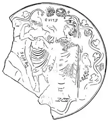 The Vulci Bronze Mirror has two registers, divine figures in the top register and Earthly figures on the bottom, a reare feature of the bronze mirrors. This is also one of the largest bronze mirrors that have been found.[3] The scene with the divine figures is the Presentation of Epiur to Tinia. Thalna is on the far left of the scene facing the right to watch the presentation. She is semi-nude, with her breasts exposed, holding a scepter, that may be in the shape of a pomegranate. Hercle is standing next to Thalna holding his club in one hand and Epiur in the other. He is nude with a diadem in his hair. Epiur is sitting in Hercle's arm as he is held out toward a seated Tinia. Epiur is depicted as an infant with the face of an older, balding man. He is also depicted nude, with wings. Tinia is seated on his throne, holding a thunderbolt in the crook of his arm. He is semi-nude with his chiton draped around his waist. Turan is seated on the far right of the scene. She is also semi-nude with her breasts exposed. She and Thalna are adorned with necklaces and earrings. A goose is next to Turan. The figures names are inscribed above their heads on the mirror.