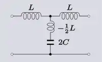 It can sometimes be useful to make such a transformation, not for the purposes of actually building the transformed circuit, but rather, for the purposes of aiding understanding of how the original circuit is working. The following circuit in bridged-T topology is a modification of a mid-series m-derived filter T-section. The circuit is due to Hendrik Bode who claims that the addition of the bridging resistor of a suitable value will cancel the parasitic resistance of the shunt inductor. The action of this circuit is clear if it is transformed into T topology - in this form there is a negative resistance in the shunt branch which can be made to be exactly equal to the positive parasitic resistance of the inductor.[14]