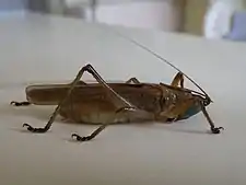 Erechthis levyi is light-brown in color with a prominent dark brown stripe running dorsally along the midline from the thorax to the tips of the wings. The face is turquoise-blue in color as are the distal tips of the legs. The blue coloration disappears in preserved specimens. Adults measure between 46–51 mm (1.8–2.0 in) in body length, with females about 5 mm (0.20 in) longer than males. Compared to the other two species in the genus (E. gundlachi and E. ayiti), E. levyi is more robust in overall body shape, and females bear a much longer ovipositor, about 22 mm (0.87 in), compared to those of either of the female congeners, 14–17 mm (0.55–0.67 in) .[1]