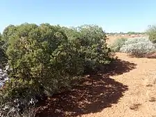 Eremophila linearis is a glabrous shrub with sticky, shiny leaves and branches due to the presence of large amounts of resin. It grows to a height of between 1 and 4 m (3 and 10 ft) and its branches are thin with persistent leaf bases. The leaves are arranged alternately and densely clustered near the ends of the branches. They are mostly 30–40 mm (1–2 in) long, 3–5 mm (0.1–0.2 in) wide, linear to lance-shaped and covered with small raised resin glands.[2][3]