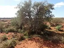 Kopi poverty bush occurs between Kalgoorlie and Cue[3] in the Avon Wheatbelt, Carnarvon, Coolgardie, Gascoyne, Great Victoria Desert, Murchison and Yalgoo biogeographic regions[6] where it grows on sandy hills or in clay flats near salt lakes and drainage lines.[2]