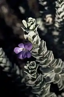 Eremophila rhegos is a flowering plant in the figwort family, Scrophulariaceae and is endemic to Western Australia. It is an erect shrub with densely hairy leaves and branches and blue, mauve, purple or white flowers.
