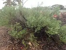Eremophila rugosa is an erect shrub which grows to a height of between 0.5 and 2 m (2 and 7 ft). Its branches and leaves are sticky and shiny due to the presence of resin. The branches are ribbed and have fine, branched hairs but these are usually obscured by resin. The leaves are arranged alternately along the branches and are mostly 7.5–25 mm (0.3–1 in) long, about 1 mm (0.04 in) wide, roughly cylindrical in shape, sticky and shiny.[2][3]