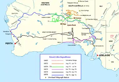 In 1880 he published The Journal of a Forgotten Expedition, it being an account of his second and third expeditions, then in 1889 appeared Australia Twice Traversed: The Romance of Exploration[1] in two substantial volumes. This gives an account of his five expeditions. He made a number of other minor journeys and his last years were spent as a clerk in the Inspector of Mines' office at Coolgardie, where his great knowledge of the interior was always available for prospectors. Giles was made a fellow and awarded the Patron's Gold Medal[lower-alpha 1] of the Royal Geographical Society in 1880 and was made Cavaliere dell'Ordine della Corona d'Italia (Knight of the Order of the Crown of Italy) by King Vittorio Emanuele II.[1]