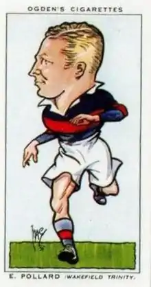 Ernest "Ernie" Pollard (fourth ¼ 1910[4] – death unknown) was an English professional rugby league footballer who played in the 1920s and 1930s. He played at representative level for Great Britain, England and Yorkshire, and at club level for Wakefield Trinity (Heritage № 330) (captain), Leeds (Heritage №) and Bradford Northern (Heritage №), as a centre, or stand-off, i.e. number 3 or 4, or, 6.[1] Ernie Pollard's career was ended in October 1938 when he suffered a severe knee injury.[5]