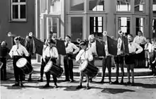 The pioneer group was loosely based on Scouting, but organised in such a way as to teach schoolchildren aged 6 – 14 socialist ideology and prepare them for the Freie Deutsche Jugend, the FDJ.[6] Afternoons spent at the pioneer group mainly consisted of a mixture of adventure, myth-like socialist teaching and the upkeep of revolutionary traditions.[7] In the summer, children usually went to pioneer camps similar to the West German Wandervogel groups or the Scouts. International pioneer camps were also common, intended to foster friendship between different nationalities.[8]