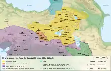 After dealing with the problems in Sidon and Cilicia, Esarhaddon turned his attention to Urartu. At first, he struck at the Mannaeans, a people allied with Urartu, but by 673 he was openly at war with the kingdom of Urartu itself.[10] As part of this war, Esarhaddon attacked and conquered the kingdom of Shupria, a vassal kingdom to Urartu whose capital Ubumu was located on the shores of Lake Van.[39] The king's casus belli for this invasion was the king of Shupria's refusal to hand over political refugees from Assyria (possibly some of the conspirators behind Sennacherib's death) and though the Shuprian king had agreed to give up the refugees after a long series of letters, Esarhaddon considered it took him too long to relent. The Assyrians seized and plundered the city after the defenders had attempted to burn down the Assyrian siege weapons and the fires had instead spread into Ubumu. The political refugees were captured and executed. Some criminals from Urartu, who the Shuprian king had similarly refused to give up to the king of Urartu, were seized and sent to Urartu, perhaps in order to improve relations. Ubumu was repaired, renamed and annexed, with two eunuchs being appointed as its governors.[40]
