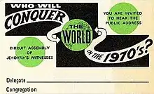 During the 1960s and early 1970s, Witnesses were instructed by means of articles in their literature[146][147][148] and at their assemblies that Armageddon and Christ's thousand-year millennial reign could begin by 1975. Strong statements for 1975 appeared, sometimes accompanied with cautionary remarks.[149] The booklet The Approaching Peace of a Thousand Years, which was the text of the keynote address to major assemblies of Jehovah's Witnesses throughout the world in 1969,[150] stated about that promised reign (which would begin at "God's fixed time"):