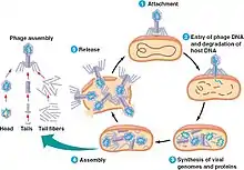 Once inside the cell, replication can begin. The virus starts by breaking down all E. coli genetic material. This is known as the lytic cycle. The virus can now occupy the cell of the E. coli without being inhibited by proteins or enzymes of the host. The CC30 genetic material is then capable of using the residue E. coli proteins to assist with viral replication. Enterobacter virus CC31 has most of the genes responsible for coding proteins to induce gene expression and replication: endonuclease, RNA polymerase, DNA polymerase, RNA primase, DNA ligase, topoisomerase, and DNA helicase.[15] Therefore, CC31 does not require access to E. coli's nucleus and does not have to wait for mitosis to occur in order to act in a parasitic fashion. This allows for rapid formation of virus particles within the empty cell. DNA is amplified, while proteins are made for the virion construction. Protein subunits combine into domains to make the individual components of the virion. The viral particles begin to combine once overcrowding of the cell occurs. The E. coli cell will lyse due to over-population, allowing the virions to burst out of the cell and move on to the next host.[13][16][17]