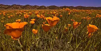Its native habitat includes California and extends to Oregon, Washington, Nevada, Arizona, New Mexico, Sonora and northwest Baja California.[2] The Antelope Valley California Poppy Reserve is located in northern Los Angeles County. At the peak of the blooming season, orange flowers seem to cover all 1,745 acres (706 ha) of the reserve. Other prominent locations of California poppy meadows include Bear Valley (Colusa County) and Point Buchon (San Luis Obispo County).