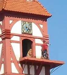The Dietemann, symbol of Eschwege, blows his horn on the hour after emerging from the Eschweger Schloss Tower.