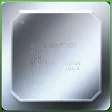 ![]() An illustration of the Wii U MCM without heat spreader. The smaller chip, lower right, is the "Espresso" CPU made by IBM. The other chips are the "Latte" GPU (large chip) from AMD and an EEPROM chip (tiny) from Renesas. | |