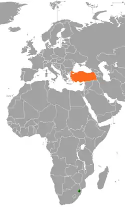 Eswatini–Turkey relations are the foreign relations between Eswatini and Turkey. The Turkish ambassador in Pretoria, South Africa is also accredited to Eswatini.[1] Eswatini’s embassy in Brussels is also accredited to Turkey.[1]