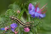 The most important host plant is the viper's bugloss, but also Anchusa officinalis and plants from the genus Symphytum. Pupae are attached to dead wood.