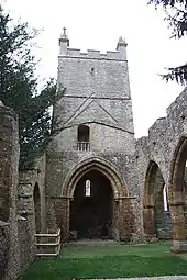 In 1794 a parish vestry meeting decided to replace the ancient church in Lower Ettington with a new one in Upper Ettington, which had become the centre of population even before Evelyn Shirley had the old village demolished. In 1795 Parliament passed an act authorising this and in 1798 the new church of St Thomas of Canterbury was consecrated.[3] The 12th-century church was abandoned, but in 1823 its south transept was restored as a mortuary chapel for the Shirleys. The rest of the original church, including its broad and distinctive tower, survives as a roofless ruin.[10] It is a scheduled monument[9] and a Grade I listed building.[11] Its poor state means that it's on Historic England's Heritage at Risk Register .[12]