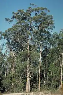 Eucalyptus carnea, known as the thick-leaved mahogany[2] or broad-leaved white mahogany,[3] is a species of tree that is endemic to coastal areas of eastern Australia. It has rough, stringy bark from the trunk to the thinnest branches, lance-shaped or curved adult leaves, flower buds in groups of between seven and eleven, white flowers and cup-shaped to hemispherical fruit.[2][3]
