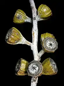 Eucalyptus corrugata, also known as rough fruited mallee[2] or rib-fruited mallee,[3] is a species of tree or mallee that is endemic to Western Australia. It has rough scaly or fibrous bark on the lower part of its trunk, smooth bark above, glossy, lance-shaped adult leaves, prominently corrugated flower buds arranged in groups of three in leaf axils and ribbed, conical to cup-shaped fruit.