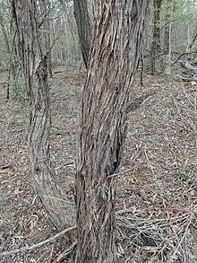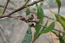 Eucalyptus helidonica typically grows to a height of around 20 metres (66 ft) and forms a lignotuber. It has rough grey or grey-brown bark and finely fibrous bark over the trunk and the larger branches, smooth on the smaller branches. Young plants and coppice regrowth have sessile, linear to narrow lance-shaped leaves that are arranged in opposite pairs and paler on the lower surface. The juvenile leaves are 60–135 mm (2.4–5.3 in) long and 7–18 mm (0.28–0.71 in) wide. Adult leaves are lance-shaped or curved and dull green but paler on the lower surface, 60–145 mm (2.4–5.7 in) long and 90–250 mm (3.5–9.8 in) wide, tapering evenly to a petiole 9–20 mm (0.35–0.79 in) long. The flower buds are arranged in leaf axils in groups of eleven or more on an unbranched peduncle 10–25 mm (0.39–0.98 in) long, the individual buds on pedicels 3–5 mm (0.12–0.20 in) long. Mature buds are oval, 4–5 mm (0.16–0.20 in) long and about 2 mm (0.079 in) wide with a conical operculum. The flowers are white and the fruit is a woody shortened spherical to barrel-shaped capsule 4–6 mm (0.16–0.24 in) long and 4–7 mm (0.16–0.28 in) wide, with the valves near rim level or enclosed below it.[2][3]