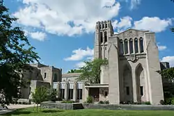 The other major non-residential structure in the Euclid Golf Allotment was St. Paul's Episcopal Church. St. Paul's had been the church of choice of the old Euclid Avenue aristocracy, but the decline of the avenue induced the church to move to Euclid Golf Allotment (where many of its parishioners had taken up residence). The church purchased several lots at the intersection of Coventry Road and Fairmount Boulevard (2747 Fairmount Blvd.), and hired architect J. Byers Hayes of the noted Cleveland architectural firm of Walker and Weeks to design the structure.[60] Construction began on the parish hall in 1927,[56] and services were first held there in April 1928.[60][61] The bell tower was finished in 1929.[62][61] The Great Depression halted additional construction for a decade.[61] Construction began on the sanctuary in 1941, but shortages of construction materials during World War II forced work to halt for several years.[63] Hayes revised his plans for the sanctuary in 1947 to reduce its cost, and construction began again in 1949.[61] The sanctuary was finished in 1951.[64]