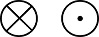 On a two-dimensional diagram, a vector perpendicular to the plane of the diagram is sometimes desired. These vectors are commonly shown as small circles. A circle with a dot at its centre (Unicode U+2299 ⊙) indicates a vector pointing out of the front of the diagram, toward the viewer. A circle with a cross inscribed in it (Unicode U+2297 ⊗) indicates a vector pointing into and behind the diagram. These can be thought of as viewing the tip of an arrow head on and viewing the flights of an arrow from the back.