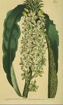 The species was first described by Maarten Houttuyn in 1780, as Asphodelus comosus.[1] The specific epithet comosus (shared by the pineapple, Ananas comosus) means "tufted".[5] In 1929, Heinrich Rudolf Wehrhahn transferred the species to Eucomis.[1] It is one of a group of larger tetraploid species of Eucomis, with 2n = 4x = 60.[6]
