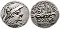 Silver tetradrachm of King Eucratides I (171–145 BC). Obv: Bust of Eucratides, helmet decorated with a bull's horn and ear, within bead and reel border. Rev: Depiction of the Dioscuri, each holding palm in left hand, spear in righthand. Greek legend: ΒΑΣΙΛΕΩΣ ΜΕΓΑΛΟΥ ΕΥΚΡΑΤΙΔΟΥ (BASILEŌS MEGALOU EUKRATIDOU) "Of Great King Eucratides". Mint monogram below. Characteristics: Diameter 34 mm, weight 16.96 g, Attic standard.[9]