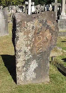 Sandow was buried in an unmarked grave in Putney Vale Cemetery at the request of his wife, Blanche. He was unfaithful to his wife later in marriage, and she refused to mark his grave.[28] In 2002, a gravestone and black marble plaque was added by Sandow admirer and author Thomas Manly. The inscription (in gold letters) read "Eugen Sandow, 1867–1925, the Father of Bodybuilding". In 2008, the grave was purchased by Chris Davies, Sandow's great-grandson.[29] Manly's items were replaced for the anniversary of Sandow's birth that year and a new monument, a one-and-a-half-ton natural pink sandstone monolith, was put in its place. The stone, simply inscribed "SANDOW 1867-1925", is a reference to the ancient Greek funerary monuments called steles.