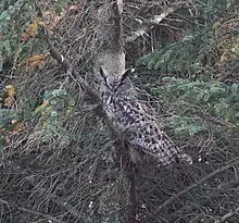 Due to their preference for rocky areas, the species is often found in mountainous areas and can be found up to elevations of 2,100 m (6,900 ft) in the Alps and 4,500 m (14,800 ft) in the Himalayas and 4,700 m (15,400 ft) in the adjacent Tibetan Plateau.[6][66][70] They can also be found living at sea level and may nest amongst rocky sea cliffs.[6][17] Despite their success in areas such as sub-arctic zones and mountains that are frigid for much of the year, warmer conditions seem to result in more successful breeding attempts per studies in the Eifel region of Germany.[71] In a study from Spain, areas primarily consisting of woodlands (52% of study area being forested) were preferred with pine trees predominating the oaks in habitats used, as opposed to truly mixed pine-oak woodland. Pine and other coniferous stands are often preferred in great horned owls as well due to the constant density, which make it more likely to overlook the large birds.[6][69] In mountainous forest, they are not generally found in enclosed wooded areas, as is the tawny owl (Strix alucco), instead usually near forest edge.[6] Only 2.7% of the habitat included in the territorial ranges for eagle-owls per the habitat study in Spain consisted of cultivated or agricultural land.[69] On the other hand, compared to golden eagles, they can visit cultivated land more regularly in hunting forays due to their nocturnal habits, which allows them to largely evade human activity.[6] Other accounts make clear that farmland will only be frequented where its less intensively farmed, holds more extensive treed and bushy areas and often has limited to no irrigation; farmland areas with fallow or abandoned fields are more likely to hold more prey and are prone to less frequent human disturbance.[72][73] In the Italian Alps, it was found that almost no pristine habitat remained and locally eagle-owls nested in the vicinity of towns, villages and ski resorts.[70]