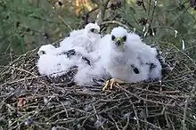 The altricial, downy chicks hatch after 33 days of incubation.[9] After hatching, the female cares for and feeds the chicks for the first 8–14 days of life, and also during bad weather after that. The male provides food, up to six kills per day in the first week increasing to eight per day in the third and 10 per day in the last week in the nest, by which time the female is also hunting.[16]