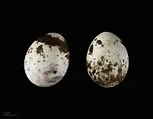The eggs are pale blue with brown spots and each measure 35–46 x 28–35 mm (1.4–1.8 x 1.1–1.4 inches),[54] and weigh about 22.5 g (0.79 oz) of which 8% is shell in a healthy egg.[9] Usually a clutch of four or five eggs is laid. The eggs are generally laid in the morning with an interval of 2–3 days between each egg. If a clutch is lost, up to two further eggs may be laid that are smaller than the earlier eggs.[16]