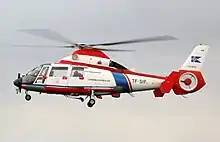 The SA 365/AS365 Dauphin 2 is a twin-engine development of the commercially unsuccessful single-engined Aérospatiale SA 360 Dauphin; only a year after the SA 360's entry into service, Aerospatiale had recognized that a platform powered by two engines rather than one was better suited to both civil and military operations, thus a redesign program was initiated.[2][3] In January 1975, the first twin-engine Dauphin prototype performed its first flight; the prototype soon demonstrated an airspeed of 170 knots in level flight and set multiple speed records, among them the Paris-London trip at an average of 322 km/h.[3] Deliveries of production models began later that decade.[2]