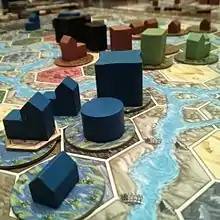Contemporary Eurogames, such as Acquire, appeared in the 1960s. The 3M series of which Acquire formed a part became popular in Germany, and became a template for a new form of game, one in which direct conflict or warfare did not play a role, due in part to aversion in postwar Germany to products which glorified conflict.[2][3] The genre developed as a more concentrated design movement in the late 1970s and early 1980s in Germany. The genre has spread to other European countries such as France, the Netherlands, and Sweden. The Settlers of Catan, first published in 1995, paved the way for the genre outside Europe.[4] Though neither the first Eurogame nor the first such game to find an audience outside Germany, it became much more popular than any of its predecessors. It quickly sold millions of copies in Germany, and in the process brought money and attention to the genre as a whole.
