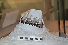 Conifer cones and twigs can be identified as the araucarian Brachyphyllum, from the terrestrial fossils of the site. Deposited in the locality are many taxa, including a large accumulation of Europasaurus bones and individuals. At least 450 bones from Europasaurus were recovered from the Langenberg Quarry, with about 1/3 bearing tooth marks[24] Of these tooth marks, the sizes and shapes match well with the teeth of fish, crocodilians or other scavengers, but no confirmed theropod marks.[24][32] The high number of individuals present suggests that a herd of Europasaurus was crossing a tidal zone and drowned.[24] While the dominant large-bodied animal present is Europasaurus, there is also material from a diplodocid sauropod, a stegosaurian, and multiple theropods. Three cervicals of the diplodocid are preserved, and from their size it is possible that the taxon was also a dwarf. The stegosaurian and variety of theropods only preserve teeth, with the exception of a few bones possibly from a taxon in Ceratosauridae.[24] Isolated teeth show that there were at least four different types of theropods present at the locality, including the megalosaurid Torvosaurus sp. as well as an additional megalosaurid and indeterminate members of the Allosauridae and Ceratosauria; and there are also the oldest teeth known from Velociraptorinae.[33][34]