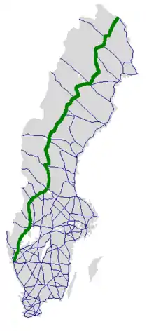 It is one of the longest national roads in Europe. It covers the stretch between Gothenburg and Karesuando via Trollhättan, Vänersborg, Mellerud, Åmål, Säffle, Grums, Sunne, Torsby, Stöllet, Malung, Mora, Sveg, Brunflo, Östersund, Strömsund, Dorotea, Vilhelmina, Storuman, Sorsele, Arvidsjaur, Jokkmokk, Gällivare, Svappavaara, and Vittangi.