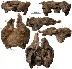 The holotype, AR-1/10, represents a disarticulated partial skeleton spread over an area of seven by three meters. It consists of a nearly complete skull, isolated left and right nasals, a dentary fragment, 15 isolated teeth, an atlas, five cervical vertebrae, two cervical ribs, possibly the first and seven more posterior dorsal vertebrae, a section of synsacrum, three isolated dorsal ribs, seven dorsal rib fragments, three caudal vertebrae, four chevrons, a coracoid with a small portion of the scapula, a scapular blade fragment, two xiphosternal plates, both partial humeri, right articulated ilium, ischium and pubis, left articulated ischium and pubis, and 70 osteoderms. The second partial skeleton AR-1/31, designed as the paratype, consists of a partial left jaw with dentary and surangular and isolated angular, ten teeth, five cervical, nine dorsal, three or four dorsosacral, one caudosacral and 14 caudal vertebrae, a sacrum, two sacral rib fragments, both ischia with fused pubes, two left ilium fragments, complete right ilium, femur, tibia and fibula, a calcaneum, four metatarsals, eight phalanges, nine unguals, and 90 osteoderms.[1]