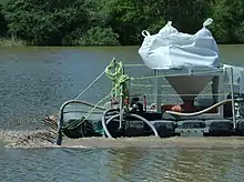 Geo-engineering is the manipulation of biogeochemical processes, usually the phosphorus cycle, to achieve a desired ecological response in the ecosystem.[66] Geo-engineering techniques typically uses materials able to chemically inactivate the phosphorus available for organisms (i.e. phosphate) in the water column and also block the phosphate release from the sediment (internal loading).[67] Phosphate is one of the main contributing factors to algal growth, mainly cyanobacteria, so once phosphate is reduced the algal is not able to overgrow.[68] Thus, geo-engineering materials is used to speed-up the recovery of eutrophic water bodies and manage algal bloom.[69] There are several phosphate sorbents in the literature, from metal salts (e.g. alum, aluminium sulfate,[70]) minerals, natural clays and local soils, industrial waste products, modified clays (e.g. lanthanum modified bentonite) and others.[71][72] The phosphate sorbent is commonly applied in the surface of the water body and it sinks to the bottom of the lake reducing phosphate, such sorbents have been applied worldwide to manage eutrophication and algal bloom.[73][74][75][76][77][78]