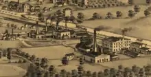 The Evens & Howard Fire Brick Company was a manufacturer of fire bricks, sewage pipe and gas retorts in what is now the Cheltenham neighborhood of St. Louis, Missouri. It was founded formally in 1855 as the Cheltenham Fireclay Works and achieved sales as far away as Quebec[1] and Africa. One source dates the beginning of the company back to 1837, but under different owners.[1] In 1855, the works were owned by Charles Chouteau.[1] The firm was incorporated in 1867 when Evens & Howard took possession of it.[1] At the time of its operation, it was one of the oldest manufacturers of fire bricks in St. Louis.[2][3] At one point, its grounds covered 133 acres (54 ha).[3] According to one report, the mining was done below ground by "pick and blast". In 1904, clay extraction took place at three mines: two in St. Louis and one in Glencoe, Missouri. The company had an extensive equipment network of cars and tracks to bring clay to the plant. Evens & Howard's offices were located on Market Street in St. Louis.[3]