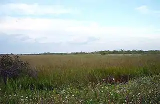 The Florida peninsula appeared above sea level between 100,000 and 150,000 years ago. As sea levels rose at the end of the Wisconsin ice age, the water table appeared closer to land. Lake Okeechobee began to flood, and convection thunderstorms were created.[13] Vast peat deposits south of Lake Okeechobee indicate that regular flooding had occurred about 5,000 years ago. Plants began to migrate, subtropical ones from the northern part of Florida, and tropicals carried as seeds by birds from islands in the Caribbean.[14] The limestone shelf appears to be flat, but there are slight rises—called pinnacles—and depressions caused by the erosion of limestone by the acidic properties of the water. The amount of time throughout the year that water is present in a location in the Everglades determines the type of soil, of which there only two in the Everglades: peat, created by many years of decomposing plant matter, and marl, the result of dried periphyton, or chunks of algae and microorganisms that create a grayish mud. Portions of the Everglades that remain flooded for more than nine months out of the year are usually covered by peat. Areas that are flooded six months or less are covered by marl. Plant communities are determined by the type of soil and amount of water present.[15][16]