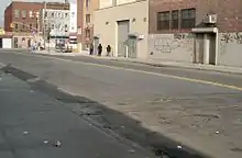 The line was out of service in January 1985.[38] Since the line was abandoned, additional plots of land along the right-of-way have been built upon or used as parking lots.[16][39][40] The remainder of the lots are vacant.[6][32][41] A private development company bought several parcels of land along the line from Conrail in 1986.[42] Some stretches of abandoned track persisted for several years: in 2000, the website Forgotten NY documented several instances of trackage that remained both on streets and in lots along the right-of-way.[40] On Hancock Street southwest of Wyckoff Avenue, a railroad crossing sign remained through the early 2000s, despite there being no visible trackage on the street.[41][40]