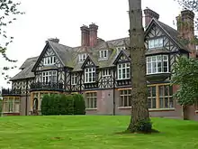 Though Christian is often referred to as being a church architect he also designed about 120 houses,[16] mainly for wealthy gentlemen. Many were built in a heavy Tudor style with large stone mullioned and transomed windows, steep roofs with dormers and tall brick chimney stacks and displaying decorative timber-framing and tile-hanging.[73] One of his earliest was Market Lavington Manor in Wiltshire (completed in 1865) for Edward Pleydell Bouverie (1818–89) a Liberal MP, Church Estates Commissioner and from 1869 an Ecclesiastical Commissioner.[74] The house has an impressive gabled exterior in red brick with blue brick diapering.[75] Christian commented in his own list of works that the house had 'brought many others in its train'.[76] His work at Glyndebourne, East Sussex in 1876 for William Langham Christie (1830–1913) involved encasing the original Tudor house in a new Tudor style brick exterior with large bay windows added to give more light to the interior.[16][77] Malwood (1883–84), a house Christian designed near Minstead in Hampshire[78] (not to be confused with Castle Malwood which is a different house) was built for the Liberal statesman Sir William Harcourt (1827–1904) and shows the influence of the architect Norman Shaw's 'Old English' style. Christian designed the building for its setting in the ridge-top clearing of a wood, close to the ancient earthworks of an Iron Age hill fort. It displays extensive half-timbering above a red brick ground floor with stone dressings and the steep roofs have large gables and dormers and clusters of tall brick chimneys.[79]