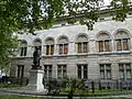 Christian was obliged to match the Greek Classical style of the National Gallery (built in 1838 by William Wilkins 1778–1839), which was set immediately to the south of the NPG site and adjoined it on its east side,[9] but he provided a strikingly original design for his main north block towards Charing Cross Road based on the style of a Florentine Renaissance palazzo.[10] The first floor for this block has large round-arched windows which bear portrait busts in roundels of famous painters, sculptors, antiquarians and historians, including Hans Holbein, Sir Peter Lely, Sir Anthony van Dyck, Sir Godfrey Kneller, Sir Joshua Reynolds, Sir Thomas Lawrence, William Hogarth, Louis Francois Roubiliac, Sir Francis Chantrey and Horace Walpole.[11] The impressive pedimented entrance block is richly treated[12] with more portrait busts in roundels, which include that for the 5th Earl Stanhope (1805–75) whose campaign in parliament had led to the NPG's foundation in 1856 (the Gallery first opened in a Georgian house in Great George Street, Westminster, in 1859). He is flanked by busts of Thomas Carlyle (1795–1881) and Thomas Babington Macaulay (1800–59), historians who gave support to the idea of a National Portrait Gallery.[13] The entrance frontage is modelled on the facade of the late 15th-century oratory of Santo Spirito in Bologna[14] which Christian probably saw on one of his earlier Italian study tours. Above the doors are the Royal Arms sculpted by Frederick C. Thomas (fl.1892–1901) who was also responsible for the busts.[15]