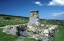 A memorial to the dead was erected at Sanaigmore Bay and unveiled on 23 June 2000.[1] The text reads "This memorial is dedicated to the memory of the 241 Irish emigrants who lost their lives on the 28th April 1847, when the brig 'The Exmouth of Newcastle' out of Derry and bound for Quebec Canada at the time of the great famine, was wrecked on the n/w coast of Islay. 108 bodies, mostly women and children (63 under the age of 14 and 9 infants) were recovered and are buried under the soft green turf of Traigh Bhan. May their souls rest forever in the Peace of Christ".