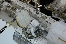 | Wheelock and Caldwell Dyson disconnected electrical and fluid connectors. The spacewalkers did not complete all of the planned tasks due to a quick disconnect that got stuck and would not release. The pair had to complete a "bake-out" in order to ensure there was no ammonia on their suits before re-entering the Space Station.[5] | ||||