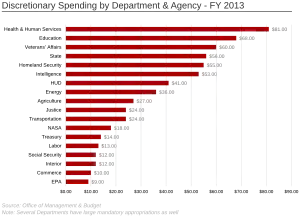 The Federal government spent approximately $600 billion during 2016 on the Cabinet departments and Agencies, excluding the Department of Defense, representing 16% of budgeted expenditures[5] or about 3.3% of GDP. The 2011 budget included estimated spending for 2010, shown in the graph at right for selected departments and agencies with over $10 billion in budget authority.