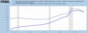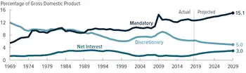 Since the federal government has historically collected about 18.4% of GDP in tax revenues, this means these three mandatory programs may absorb all federal revenues sometime around 2050.[18] Unless these long-term fiscal imbalances are addressed by reforms to these programs, raising taxes or drastic cuts in discretionary programs, the federal government will at some point be unable to pay its obligations without significant risk to the value of the dollar (inflation).[19][20]