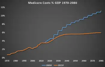 The CBO has indicated that: "Future growth in spending per beneficiary for Medicare and Medicaid—the federal government’s major health care programs—will be the most important determinant of long-term trends in federal spending. Changing those programs in ways that reduce the growth of costs—which will be difficult, in part because of the complexity of health policy choices—is ultimately the nation’s central long-term challenge in setting federal fiscal policy." Further, the CBO also projects that "total federal Medicare and Medicaid outlays will rise from 4 percent of GDP in 2007 to 12 percent in 2050 and 19 percent in 2082—which, as a share of the economy, is roughly equivalent to the total amount that the federal government spends today. The bulk of that projected increase in health care spending reflects higher costs per beneficiary rather than an increase in the number of beneficiaries associated with an aging population."[31]
