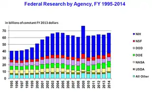 Funding for science research and development is mainly funded through discretionary funding through agencies such as the National Institutes of Health, Department of Energy Office of Science, National Aeronautics and Space Administration, and National Science Foundation. Slightly more than half of federal research and development funds go to the Department of Defense and thus overlaps with military spending.[57]
