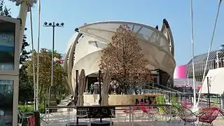 ![]() China pavilion | Studio Link-Arc | The building's predominant feature is its complex roof form. From the front it appears to be a series of curves, while at the back it forms a row of rectilinear shapes. | Exhibitor Magazine' best exterior design honorable mention[10] |
